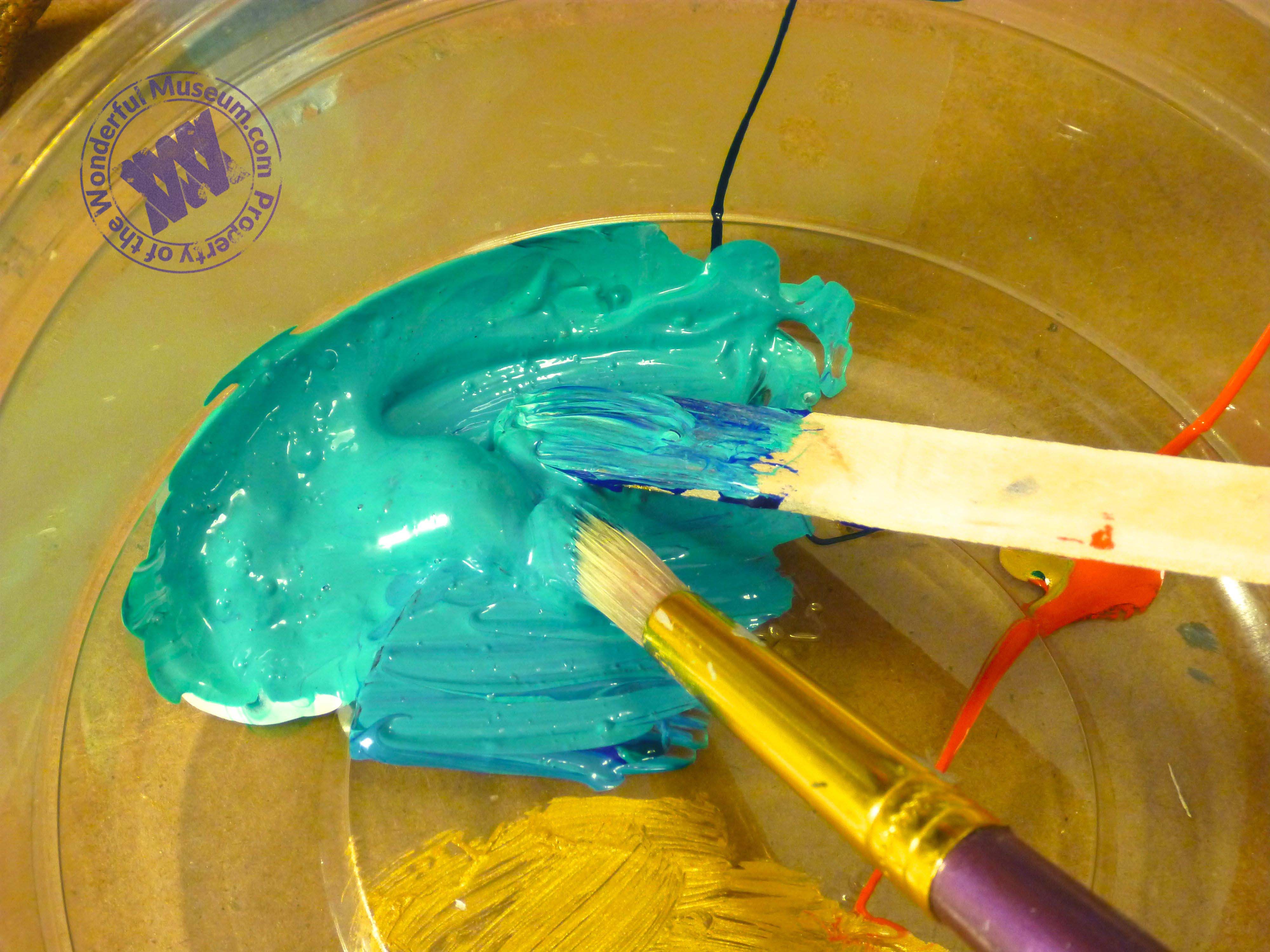 Now to add the verdigris weathering. Mix some blue and green paint together to get the right shade of verdigris. Find a statue near you that you can take pictures of for inspiration. Once you have the right color, add a couple large drops of water to the paint to thin it down and make what is called a wash.